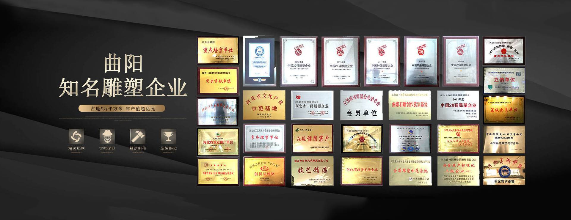 同時(shí),公司也是行業(yè)內(nèi)的佼佼者,連續(xù)七年榮獲“中國20強(qiáng)雕塑企業(yè)”,并被命名為“全國雕塑示范基地”,在國內(nèi)外雕塑藝術(shù)領(lǐng)域享有較高聲譽(yù)。2017年,曲陽縣河北鑫特園林雕塑公司還被文化部、教育部、人社部命名為“中國非遺石雕傳承人群研培實(shí)訓(xùn)基地”。